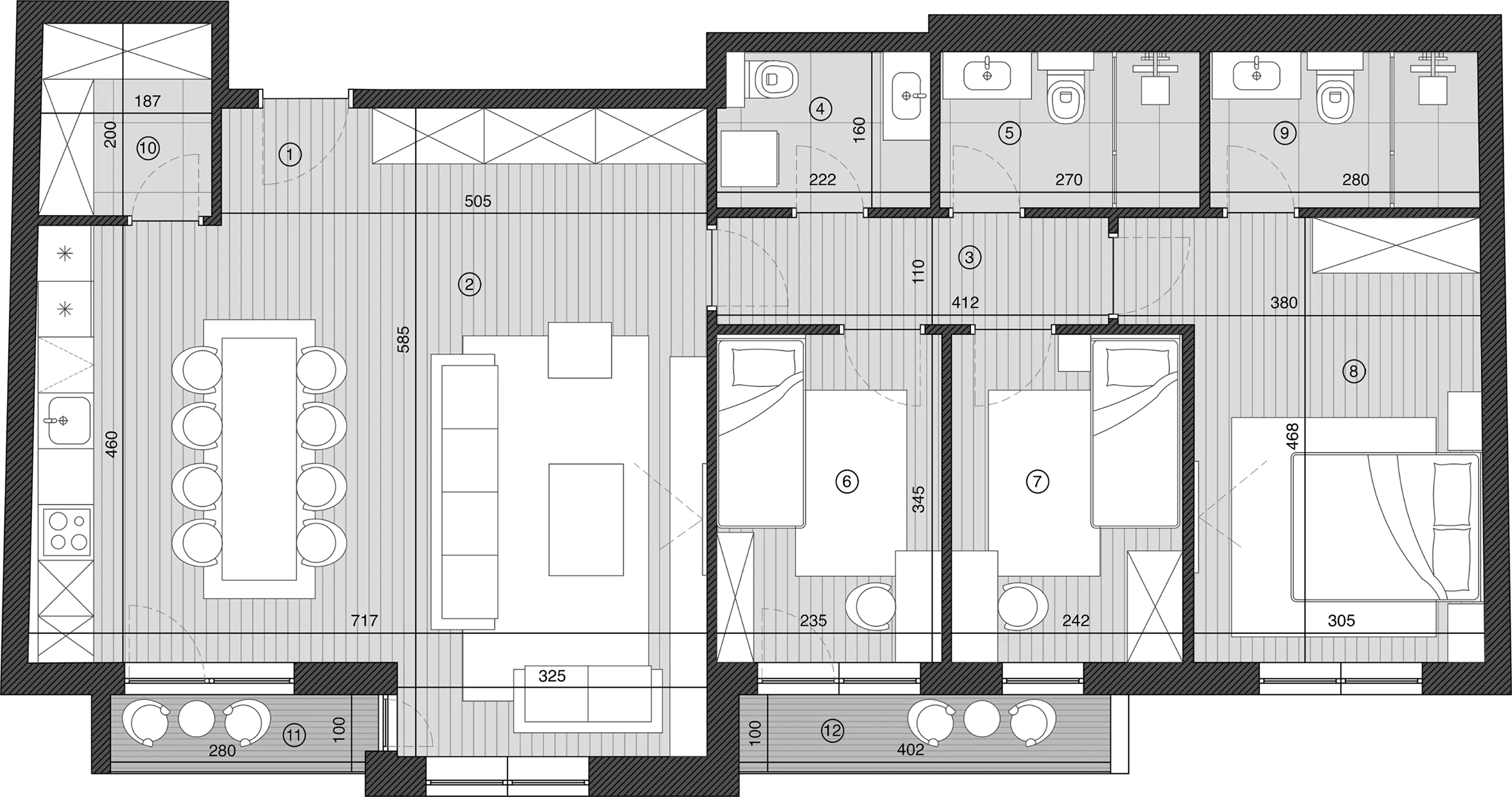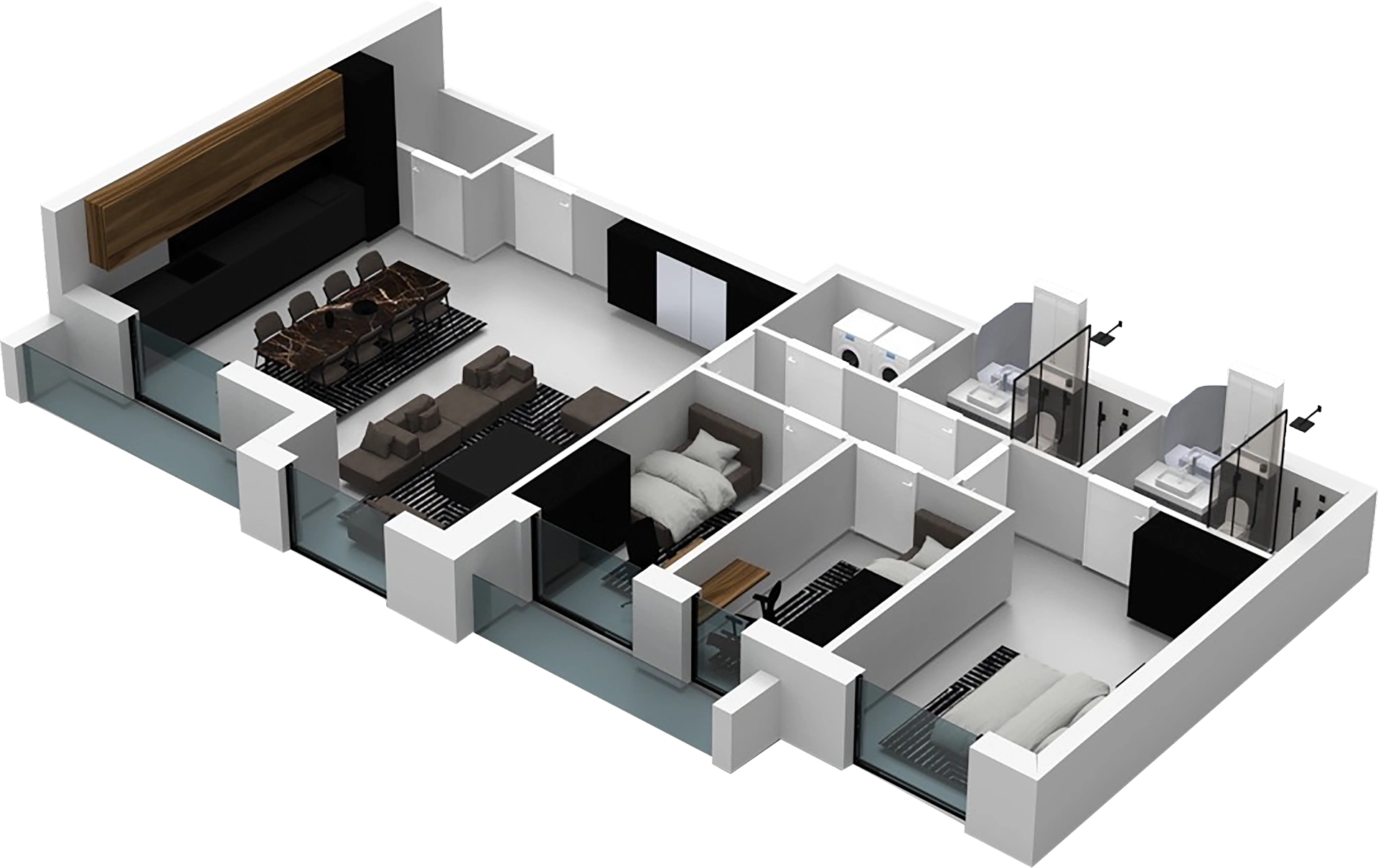 This 100m² four-bedroom apartment offers a large, bright living room connected to the dining area, ideal for family gatherings. The kitchen is functionally positioned, and the layout includes three comfortable bedrooms, including a master with a private bathroom. Two terraces provide additional outdoor space and privacy.